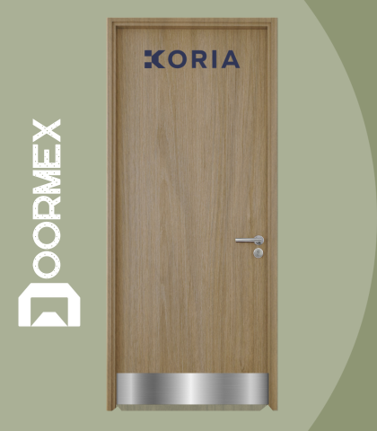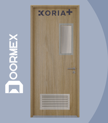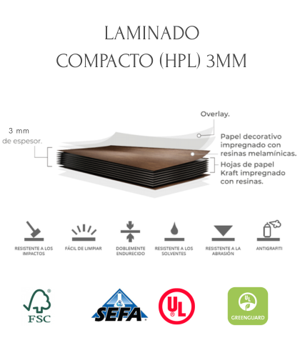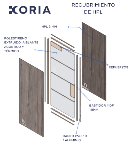 Puerta de acceso con recubrimiento de sólido fenólico 3mm. Bastidor MDF, Poliextireno extruido (aislante acústico y térmico), Refuerzo interior y maquinado para cerraduras. Canto de PVC, 4 colores de línea.