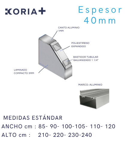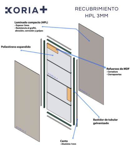 Puerta de acceso con recubrimiento de sólido fenólico 3mm. Bastidor tubular galvanizado, Poliextireno extruido (aislante acústico y térmico), Refuerzo interior y maquinado para cerraduras, Canto de aluminio, 4 colores de línea.